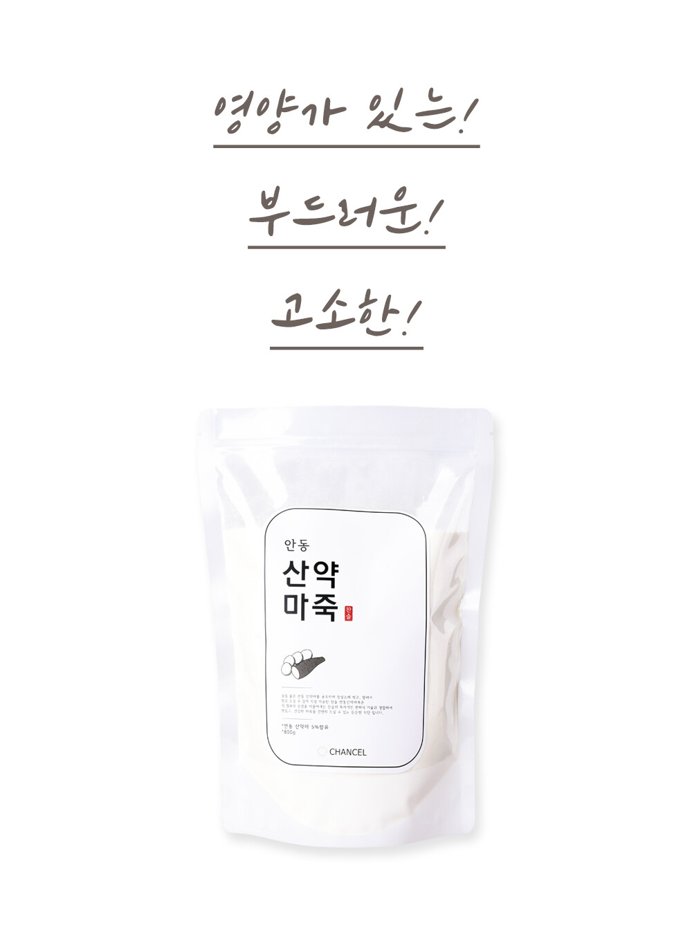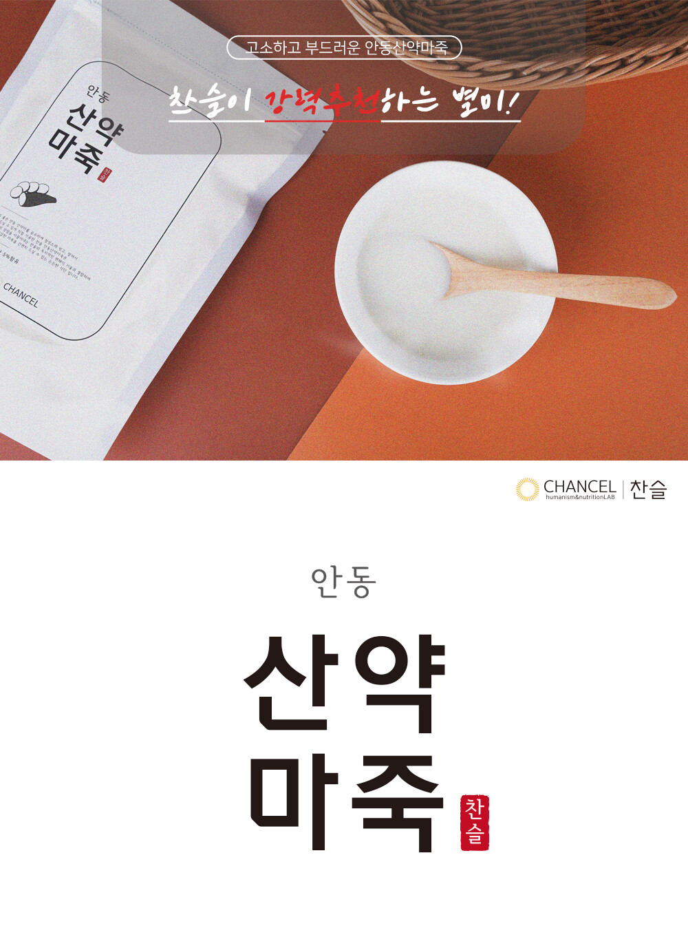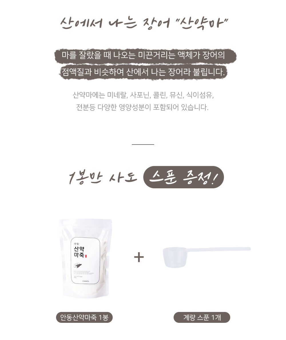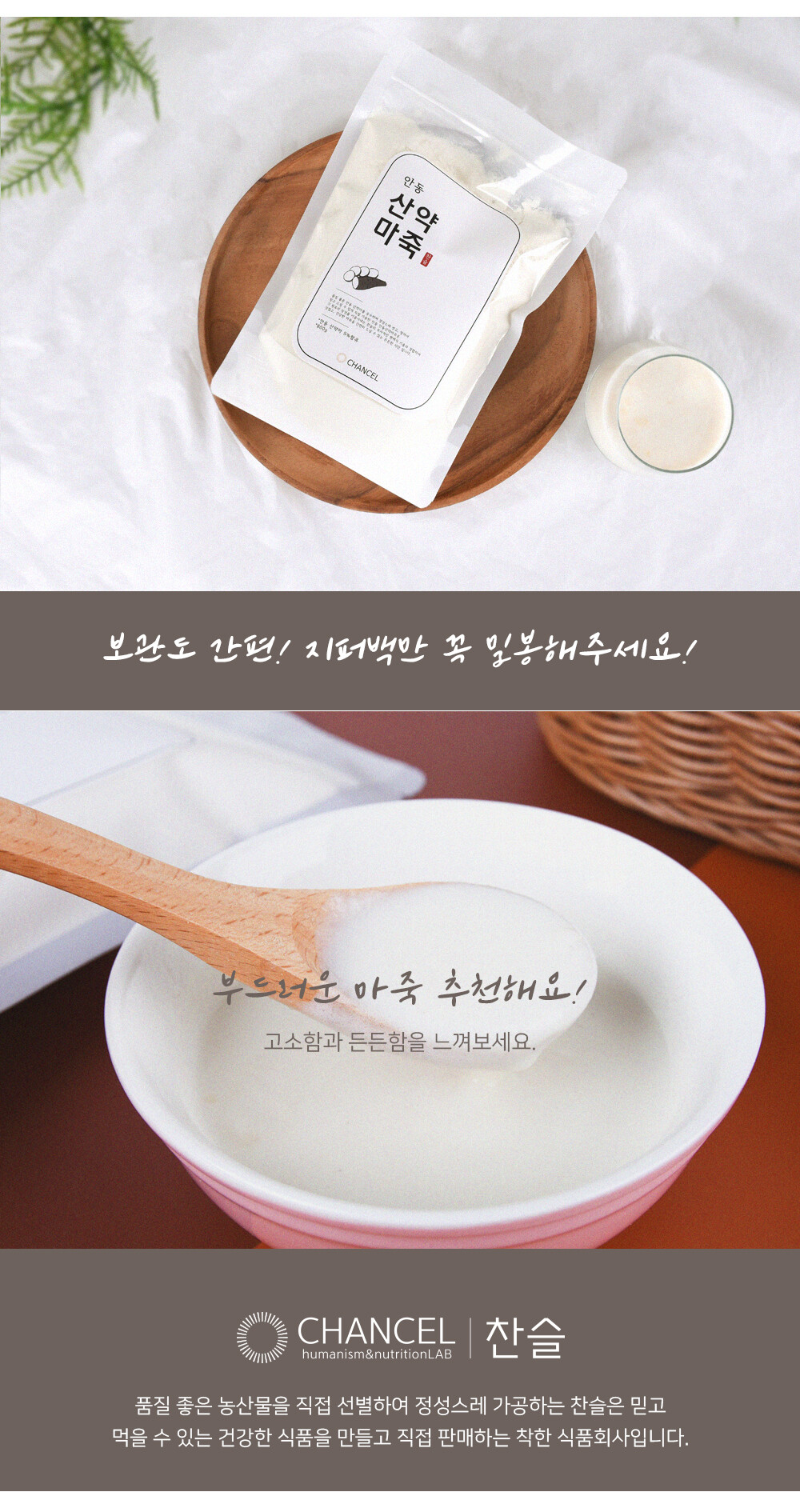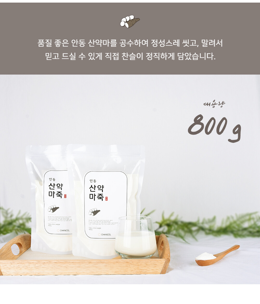 품질 좋은 안동 산약마를 공수하여 정성스레 씻고, 말려서 믿고 드실 수 있게 직접 가공한 찬슬 안동산약마죽, 찬슬 마죽은 간편히 드실 수 있는 든든한 간편식입니다.