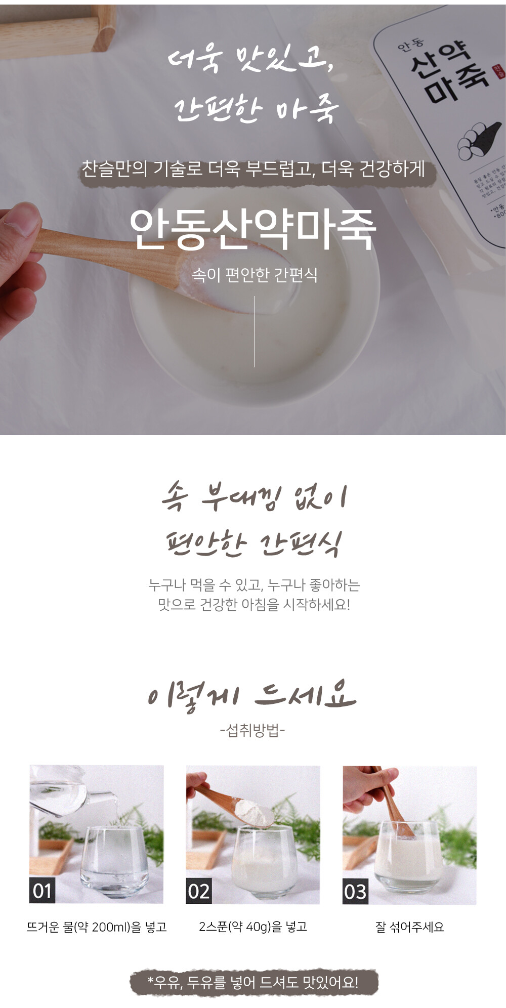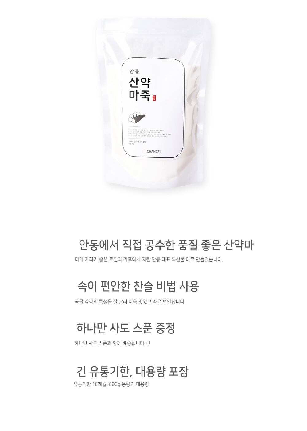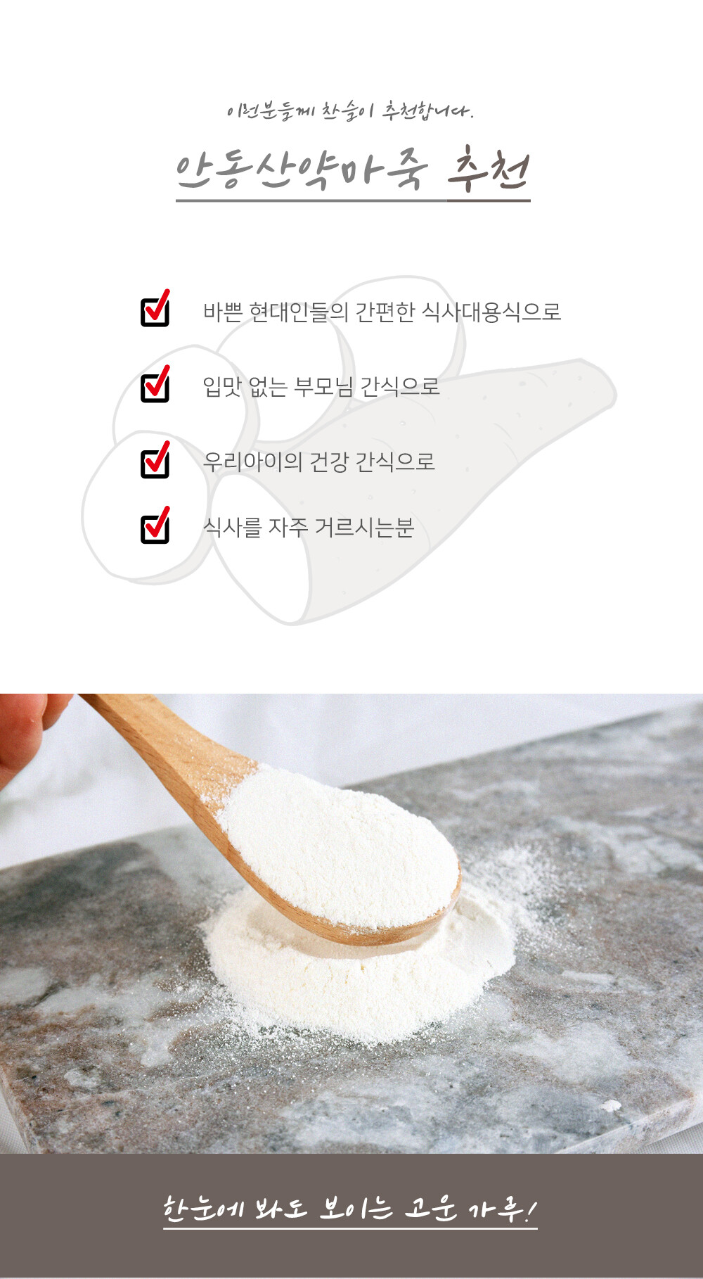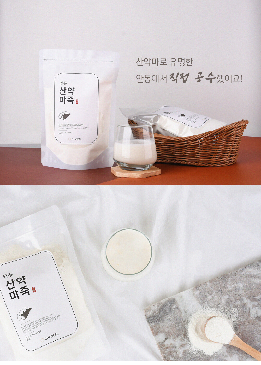 품질 좋은 안동 산약마를 공수하여 정성스레 씻고, 말려서 믿고 드실 수 있게 직접 가공한 찬슬 안동산약마죽, 찬슬 마죽은 간편히 드실 수 있는 든든한 간편식입니다.